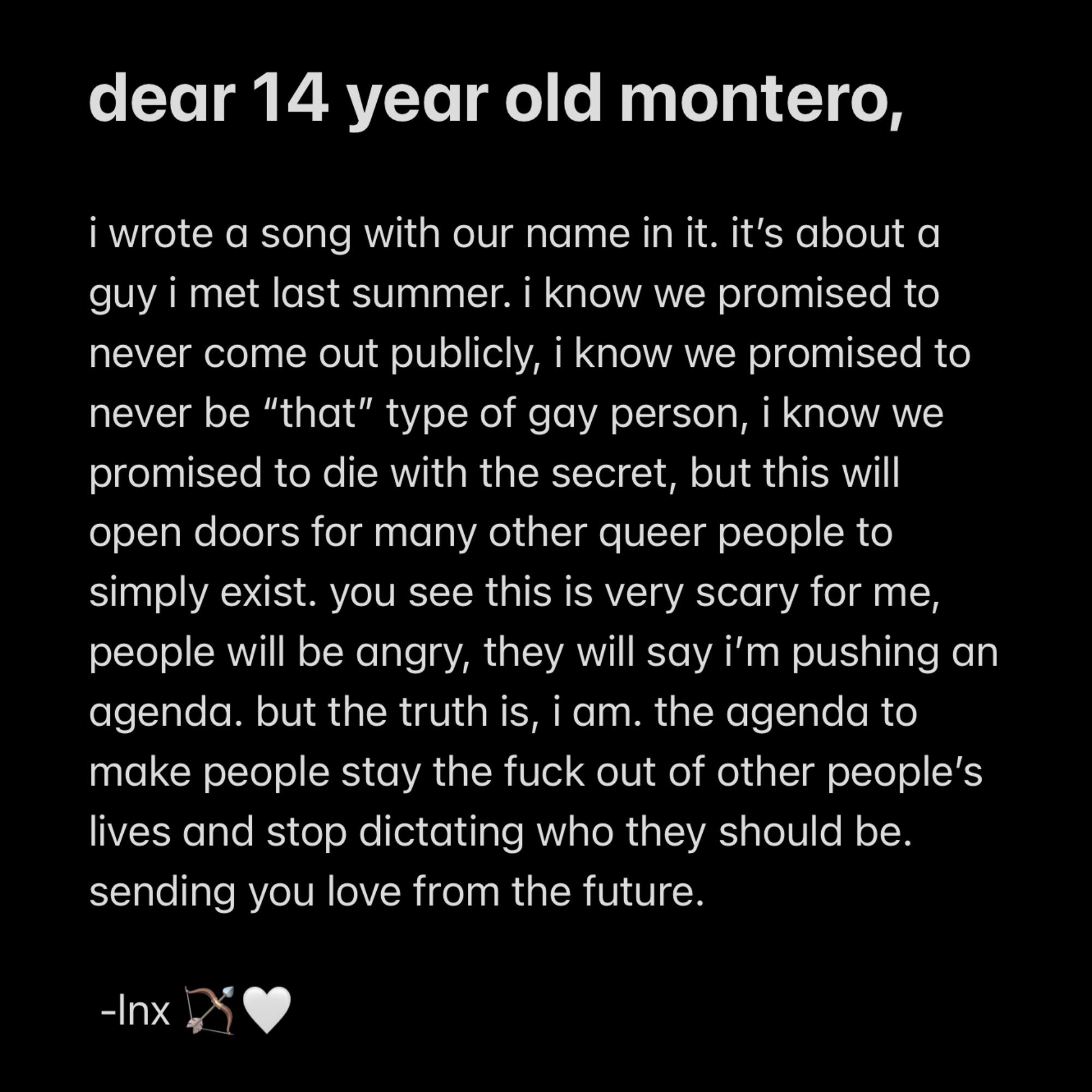 Congratulations to Lil Nas X on the birth of his album. Prior to this songs released Lil Nas X posted the following message for his younger self on Twitter on the 2nd of February 2021 Dear 14 year old Montero I wrote a song with our name in it. A few straight.
